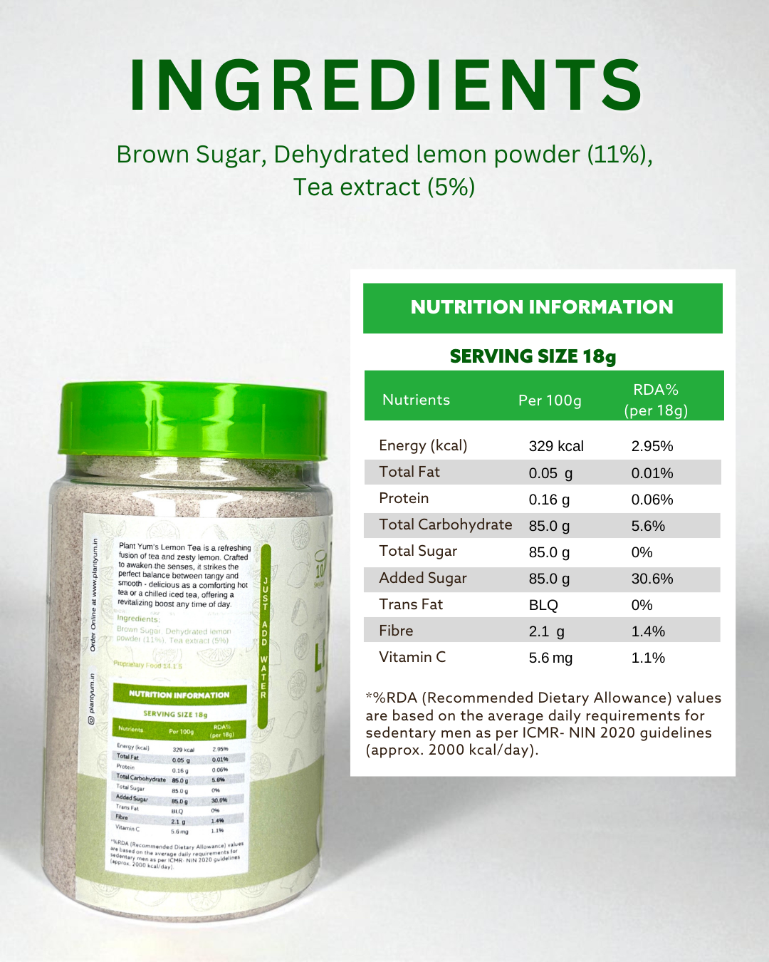 Brown Sugar, Dehydrated Lemon powder (11%), Tea Extract (5%)