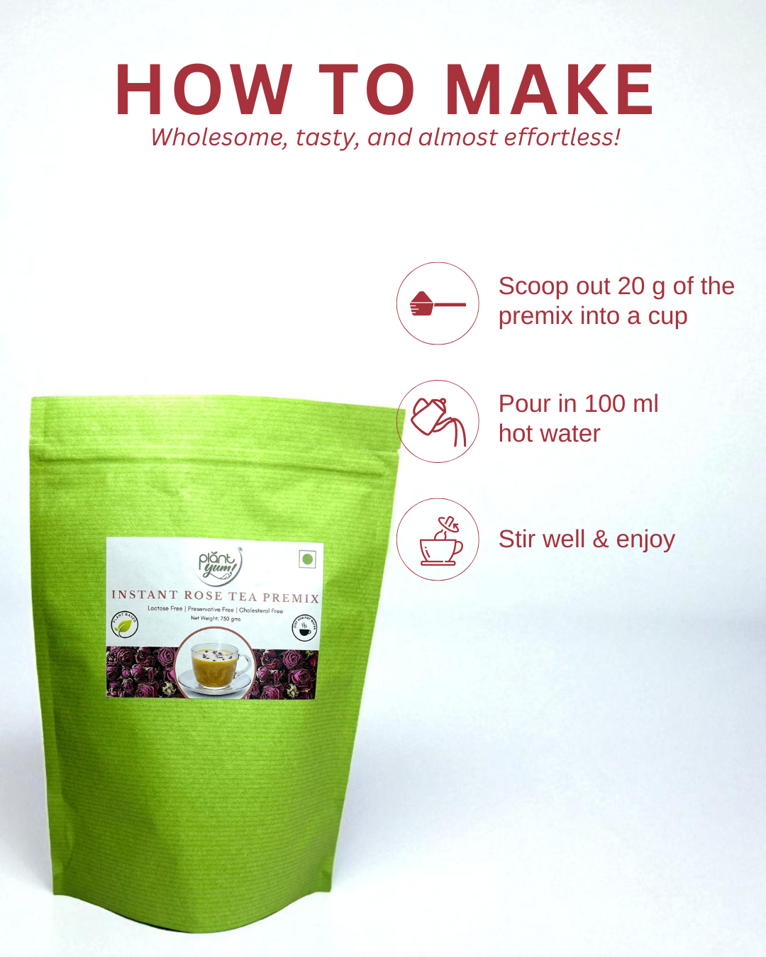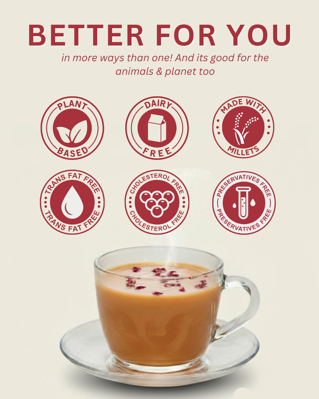 Experience the delicate aroma of real roses blended with the wholesome goodness of millets. Our Rose Tea Premix is crafted with jowar-based creamer, making it a nourishing, dairy-free alternative that’s as kind to your body as it is to your taste buds.
