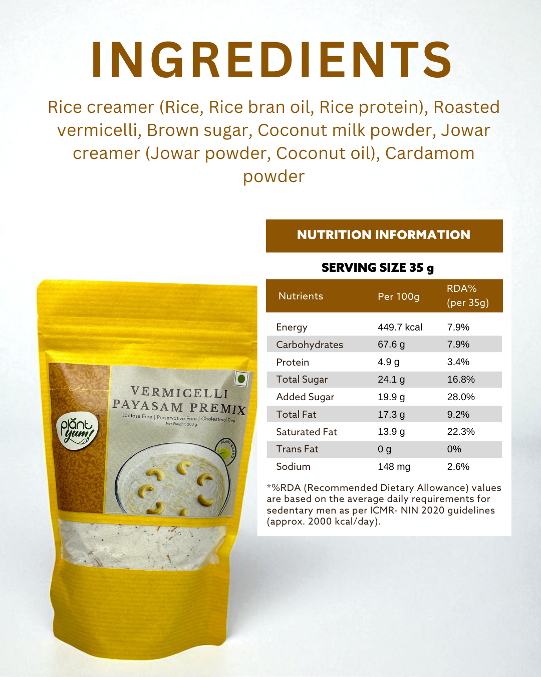 Rice creamer (Rice, Rice bran oil, Rice protein),Roasted vermicelli, Brown sugar, Coconut milk powder, Jowar creamer (Jowar powder, Coconut oil), Cardamom powder